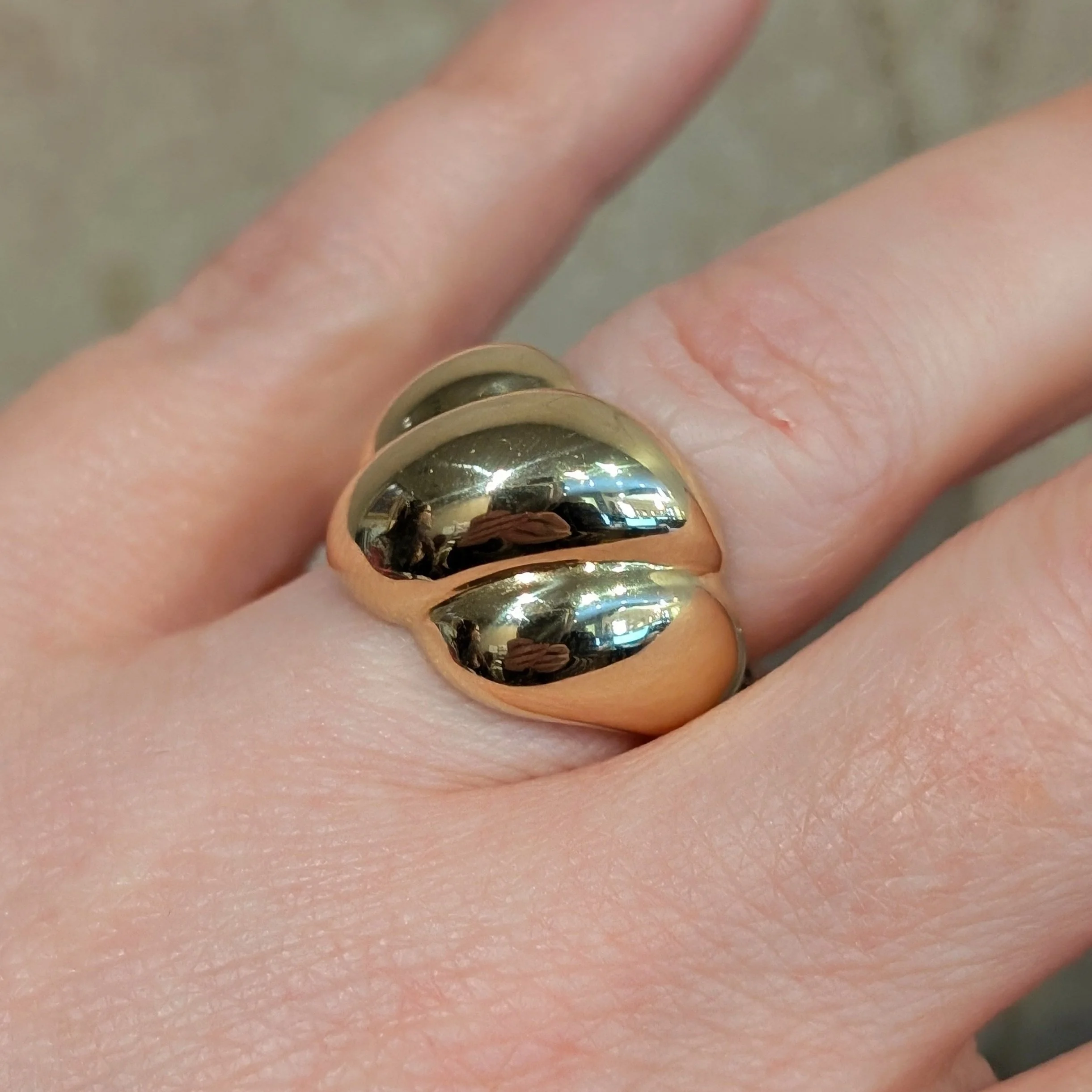 Shrimp rings have seen a steady resurgence in jewelry trends for a while because of their bold, playful shape and adaptable aesthetic. (That, and the much-needed appreciation for ‘80s looks!) Their ribbed shape tapers into a band, adding visual interest to an otherwise simple silhouette. This makes them capable of standing alone as a statement piece or pairing well with chunky chains.